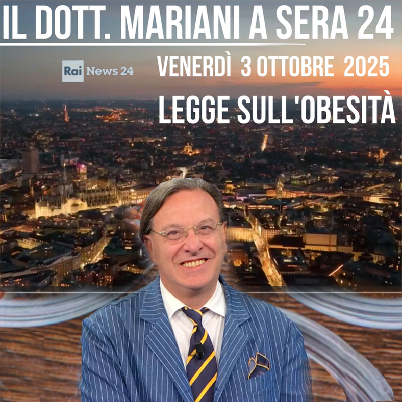 Venerdì 3 ottobre 2025 il Dottor Mariani sarà ospite di Giancarlo Usai a rainews24 SERA24 per parlare della “Legge sull’obesità” che traccia i punti cardine della lotta contro l’obesità: definizione ufficiale di obesità come malattia cronica progressiva e recidivante. Approvata in Senato la proposta di legge, firmata dall’on. @roberto_pella “Disposizioni per la prevenzione e la cura dell’obesità”. L’Italia è il primo paese al mondo a riconoscere l’obesità come malattia cronica non trasmissibile.